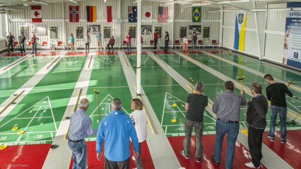 Kurz vor 16 Uhr trafen sich am 8. März bei bestem Wetter ca. 30 BCKL-Mitglieder und fielen gesammelt in der Shuffleboardhalle (www.shuffleboardmagic.de) ein. Zu Anfang wurden uns die Spielregeln erklärt und dann durften wir selber die kleinen Plastikscheiben über den Boden schubsen, ja nach Veranlagung mit mehr oder weniger Gefühl...