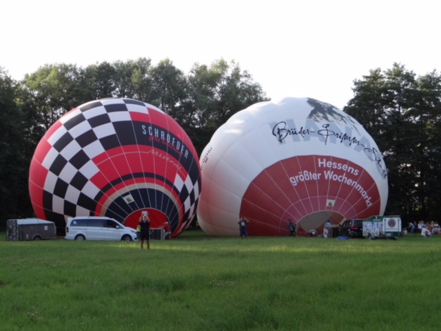 Während die Hochzeitsfotos vom Brautpaar gemacht wurden und nachdem sich auch die Ballon-Crew an dem aufgebauten kalten Buffet bedient hatte, wurde der Ballon „KINZIG“ zwischen den Bäumen, die den Platz umgeben, aufgestellt. Danach kamen die Beteiligten zum Piloten in den Korb, das Brautpaar und die Standesbeamtin. Für sie sowie die Braut war es die erste Ballonfahrt. Der Platz war weitgehend windgeschützt sodaß der Start dem Anlass entsprechend angemessen war.