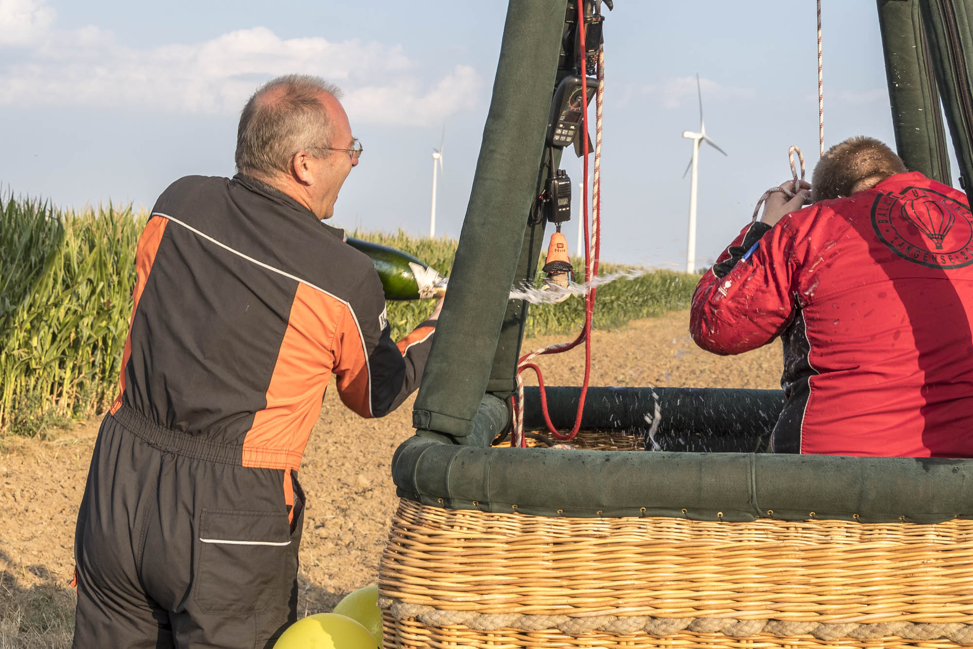 Nach ausgiebigen Landefotos wurden natürlich die Ballonneulinge, nämlich die Braut und die Standesbeamtin, nach alter Ballonfahrersitte an Ort und Stelle getauft.