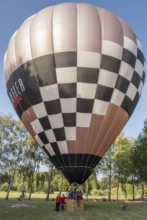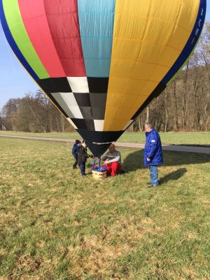 Während die Hochzeitsfotos vom Brautpaar gemacht wurden und nachdem sich auch die Ballon-Crew an dem aufgebauten kalten Buffet bedient hatte, wurde der Ballon „KINZIG“ zwischen den Bäumen, die den Platz umgeben, aufgestellt. Danach kamen die Beteiligten zum Piloten in den Korb, das Brautpaar und die Standesbeamtin. Für sie sowie die Braut war es die erste Ballonfahrt. Der Platz war weitgehend windgeschützt sodaß der Start dem Anlass entsprechend angemessen war.